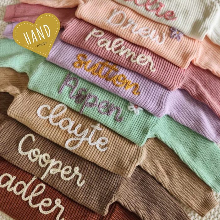 Personalize it with your munchkin’s name, hand-embroidered in a sweet cursive script. Choose your yarn thickness for the perfect touch!